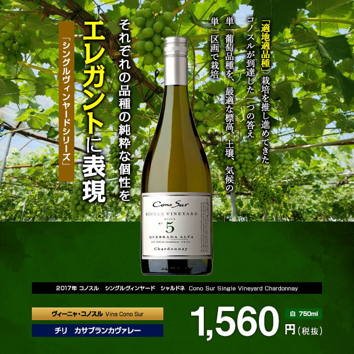 相性の良い料理:白カビタイプのチーズ(カマンベールなど)、しゃぶしゃぶ(豚肉)、鯛の塩焼き 生産地 チリ カサブランカヴァレー 商品名 コノスル シングルヴィンヤード シャルドネ 作り手 ヴィーニャ・コノスル 格付・認証 D.O. カサブランカヴァレー 生産年 最新ヴィンテージ 色・タイプ 白ワイン 内容量 750ml 本数 6本 味わい 辛口 ブドウ品種 シャルドネ 100% ガイドブック 2018年 ヴィンテージ | Descorchados(デスコルチャドス) | 92点 / 100点満点 飲み頃 今〜 飲み頃温度 10℃〜13℃ 推奨保存環境 温度=8℃〜12℃、湿度=70%〜75% 備考 においが強いものと一緒にせず、振動は避けるように保管して下さい。